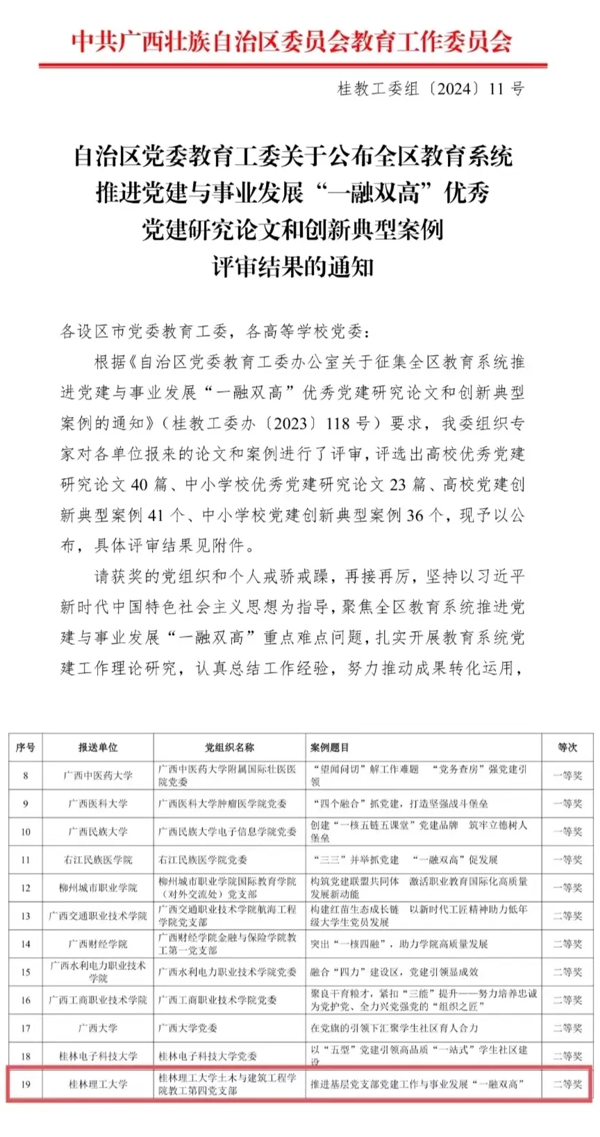 近日,自治区党委教育工委开展了全区教育系统推进党建与事业发展“一融双高”优秀党建研究论文和创新典型案例征集评选工作,经专家评审,学校推荐报送的我院教工第四党支部党建工作案例《推进基层党支部党建工作与事业发展“一融双高”》获高校组创新典型案例二等奖,为学校唯一获奖案例。