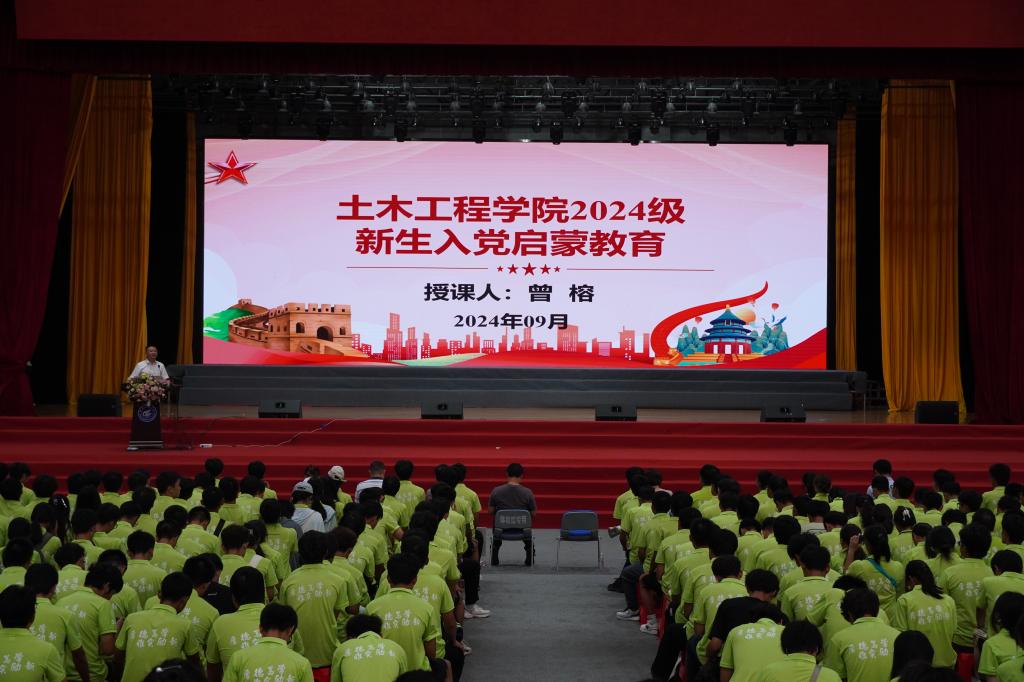 为进一步做好学院2024级本科新生入学后早启蒙、早教育、早衔接、早培养工作,增进广大新生对中国共产党的了解和认识,引导青年学生积极向党组织靠拢,树立共产主义远大理想,9月30日下午,在雁山校区新体育馆,学院党委书记曾榕为2024级本科新生讲授入党启蒙教育专题党课。学院党委委员、部分辅导员、新生班主任以及全体2024级新生共同聆听了党课。