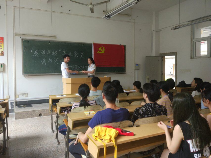 会议通过无记名方式进行投票,表决结果为李龙飞,刘晓丽,蒙依婷,侯柳梅,李宛珊,余立森6名预备党员正式按期转为中国共产党员。支部的队伍在不断壮大,以为着责任更加重大,工作需要务实到每一位党员身上,发挥党员的先锋模范作用。会议最后进行了“感恩母校,毕业生党员捐书活动”。虽然只是捐书了一本书,但实际上捐出的是一份爱心,传递的是一份支部无形的力量。