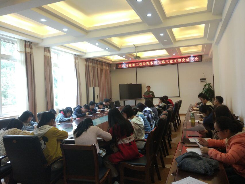2019年4月12日,中午12:10,本科生第三党支部于土木与建筑工程学院4222室召开了全体党员党支部大会,参会人员共30人,一名党员因外出面试请假。全体党员戴党员徽章,会议由支部副书记罗朝日同志主持,党支部书记安邦国同志也参加了这次会议。