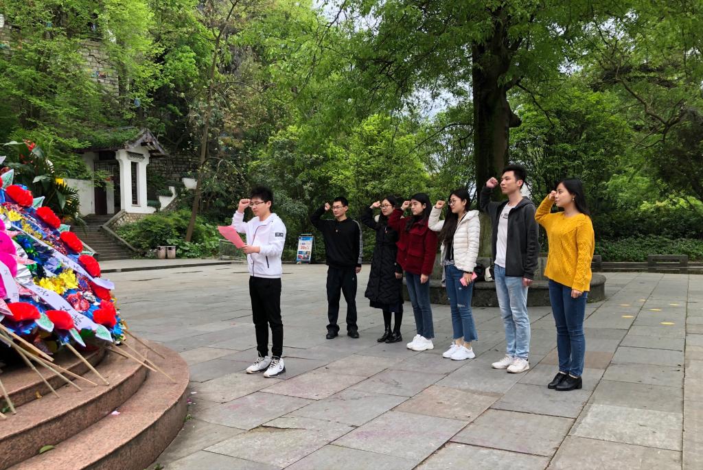 在庄严肃穆的陈光烈士纪念塔前,第一党小组党员张浩、王婷同志为革命烈士献上鲜花,研究生第五党支部书记邝贺伟同志为大家讲述陈光烈士的英勇事迹,希望党员同志铭记于心,时刻提醒着自己今天的幸福生活来之不易,应倍加珍惜。随后,全体党员默哀一分钟表达对先烈的深切悼念之情。最后,全体党员同志共同举起右手重温入党誓词,不忘初心,砥砺前行。