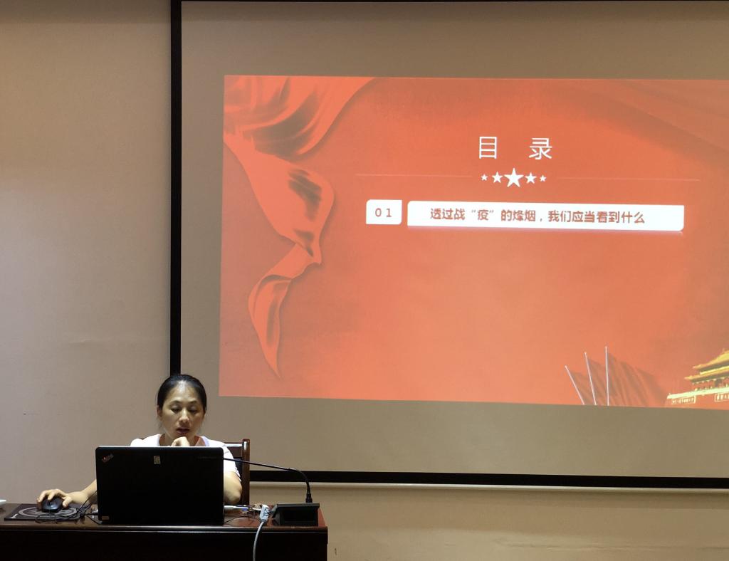 2020年7月9日下午,土木与建筑工程学院研究生第一党支部在4204开展了“党旗飘扬 筑牢红色防火墙”--高校党组织战“疫”专题微党课,由研究生第一党支部书记唐丽华为大家授课。