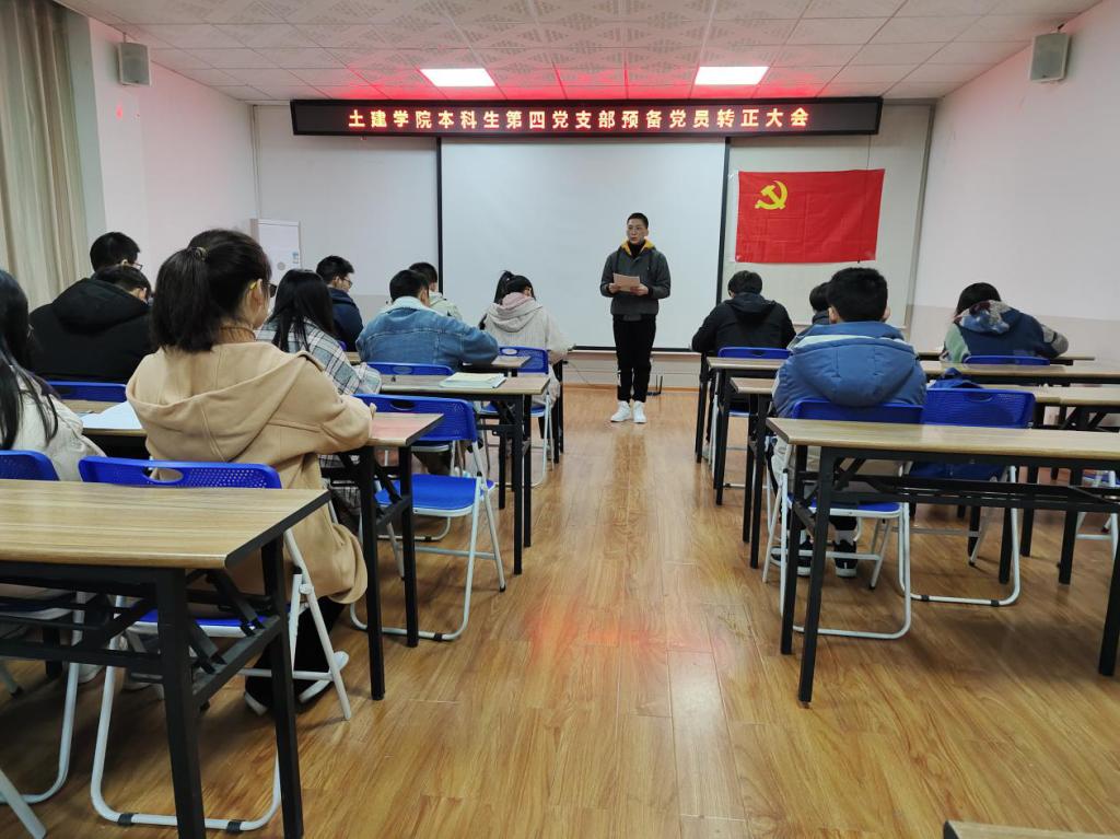12月12日晚,本科生第四党支部于4203室召开预备党员转正大会,支部全体党员参加了本次会议,会议由支部副书记张杨杨同志主持。