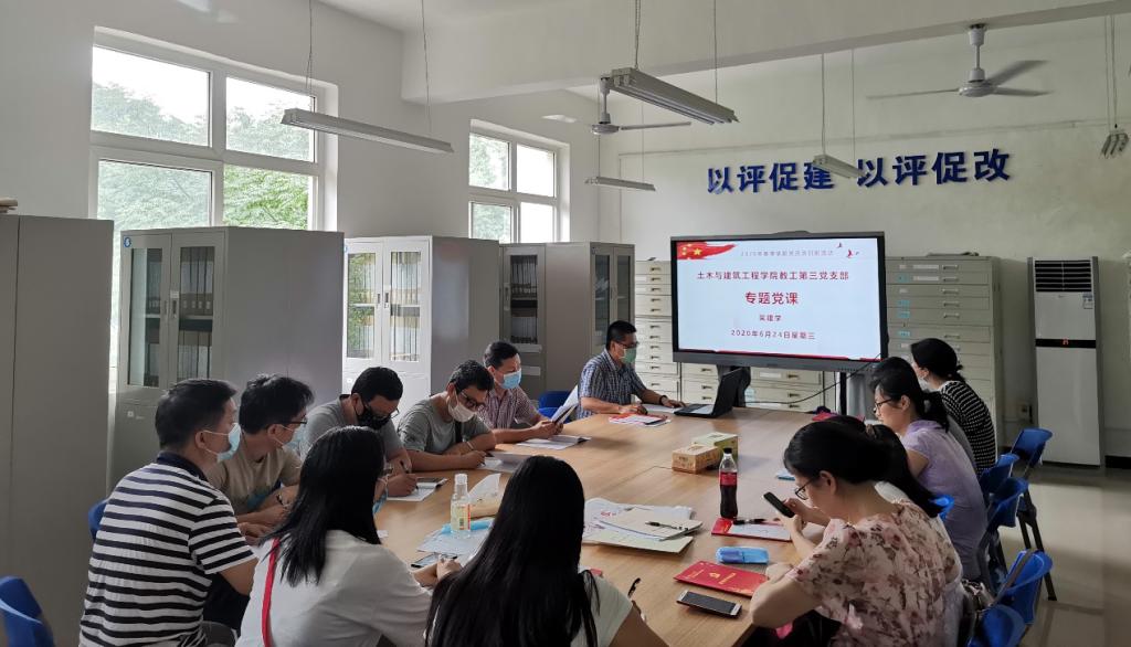 6月24日下午,土木与建筑工程学院教工第三党支部在5317开展由支部书记吴建学主持和主讲的专题党课,学院副院长虞爱平同志和支部全体党员参加了本次活动。