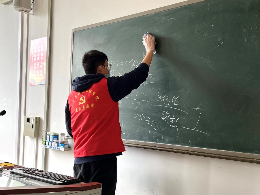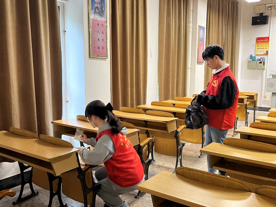 活动当天下午,同志们准时在教九栋一楼集合,分成六个小组,对楼层进行清扫。同志们互帮互助,利用自带的清洁工具,清理抽屉里的垃圾和清洁黑板,积极完成小组负责的楼层。经过同志们的努力,一间间教室恢复了整洁明亮。清扫结束,党务中心全体同志在九栋一楼进行合影留念。