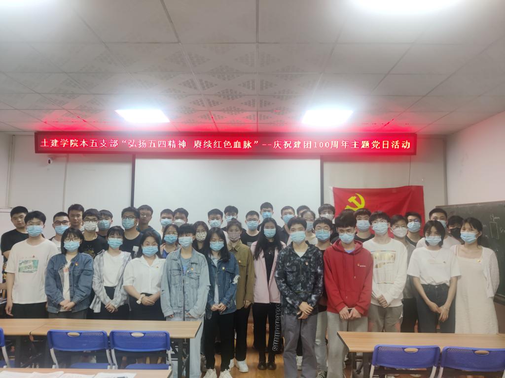 为庆祝建团100周年,弘扬五四爱国精神,喜迎二十大,唱响新时代的青春之歌,激励广大党员同志弘扬五四精神,土木与建筑工程学院本科生第五党支部于5月10日在4204组织开展以“弘扬五四精神 赓续红色血脉”为主题的党日活动。本次活动由支部书记汤玉昆同志主持,支部全体党员和发展对象参加活动。