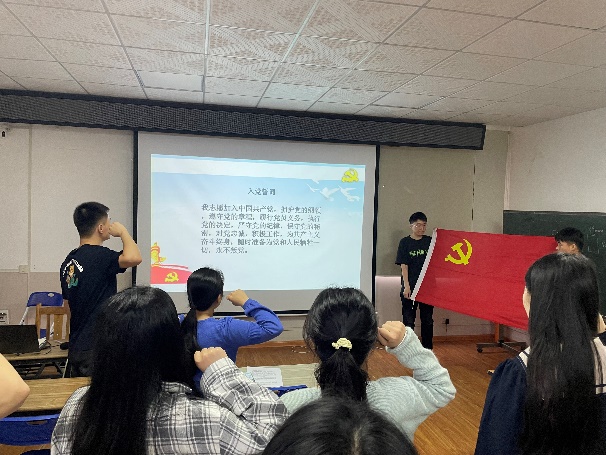最后,全体党员朗读鲁迅先生《热风》节选:愿中国青年都摆脱冷气,只是向上走,不必听自暴自弃者的话。能做事的做事,能发声的发声。有一分热,发一分光,就令萤火一般,也可以在黑暗里发一点光,不必等候炬火。此后如竟没有炬火:我便是唯一的光。朗读结束后,支部党员在党支部书记的带领下重温入党誓词。