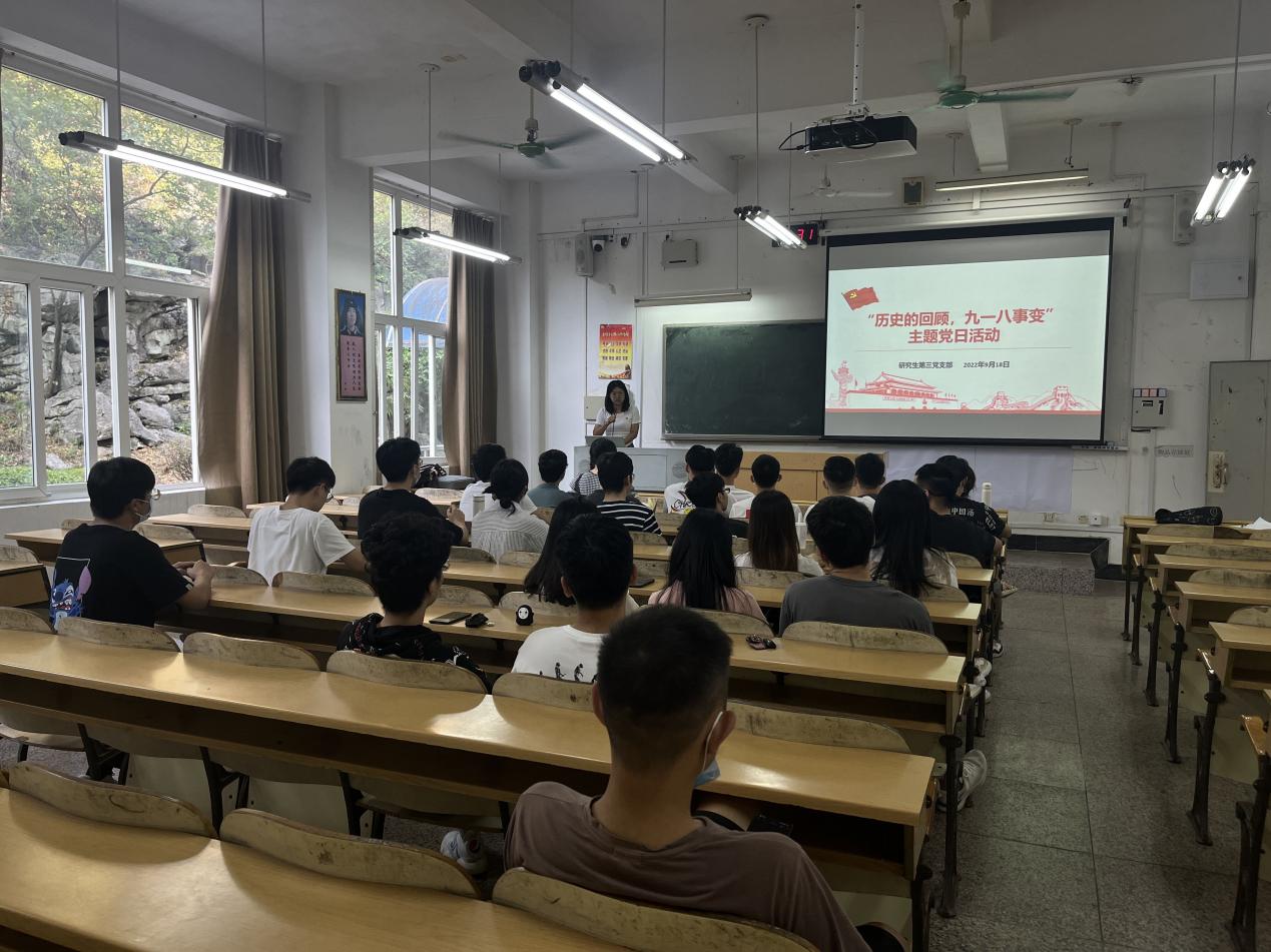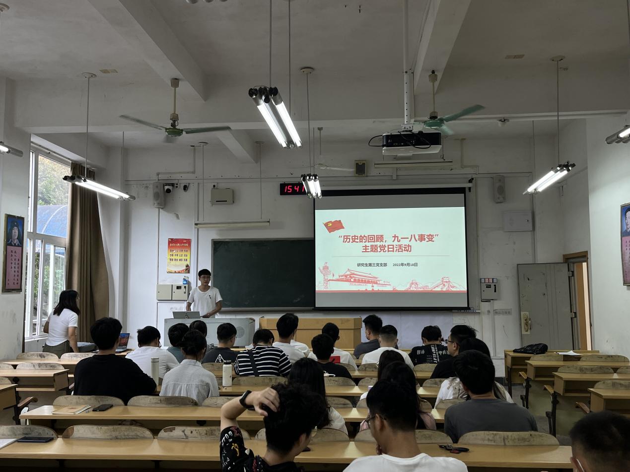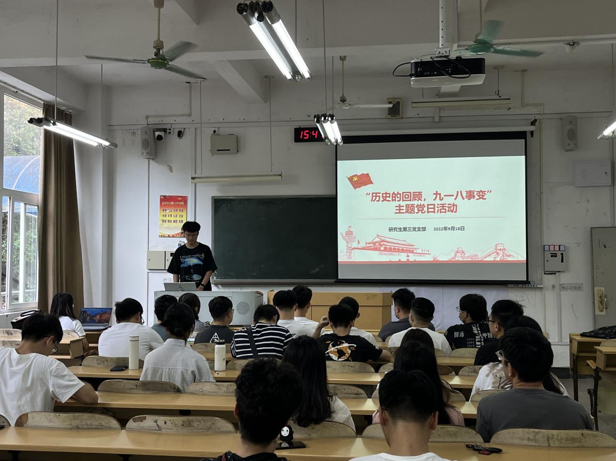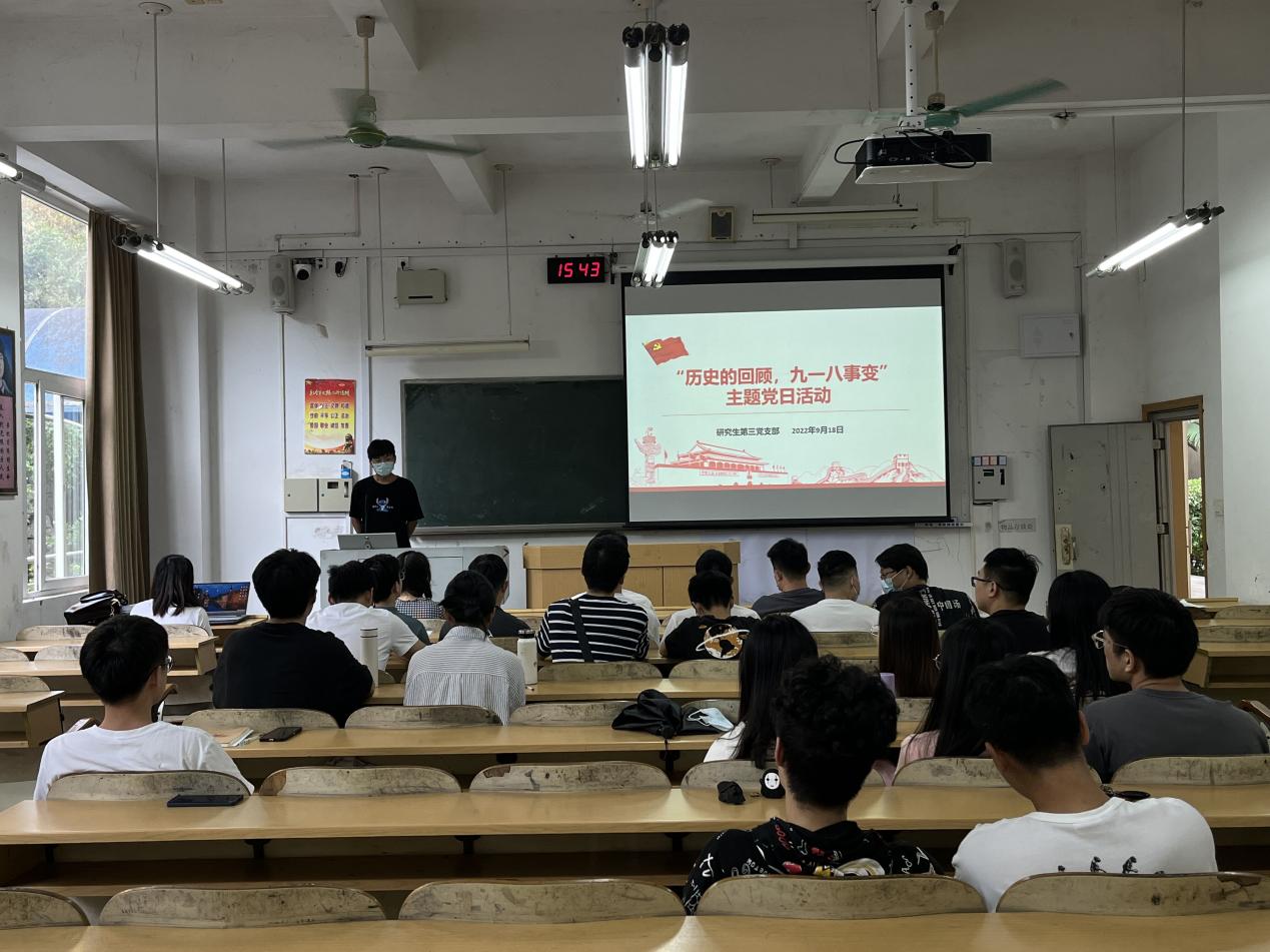 2022年9月18日上午9点30分,研究生第三党支部在屏风校区9114教室开展“历史的回顾、九一八事变”主题党日活动,本次活动由支部书记唐子晴主持,支部党员、发展对象以及积极分子参加会议。
