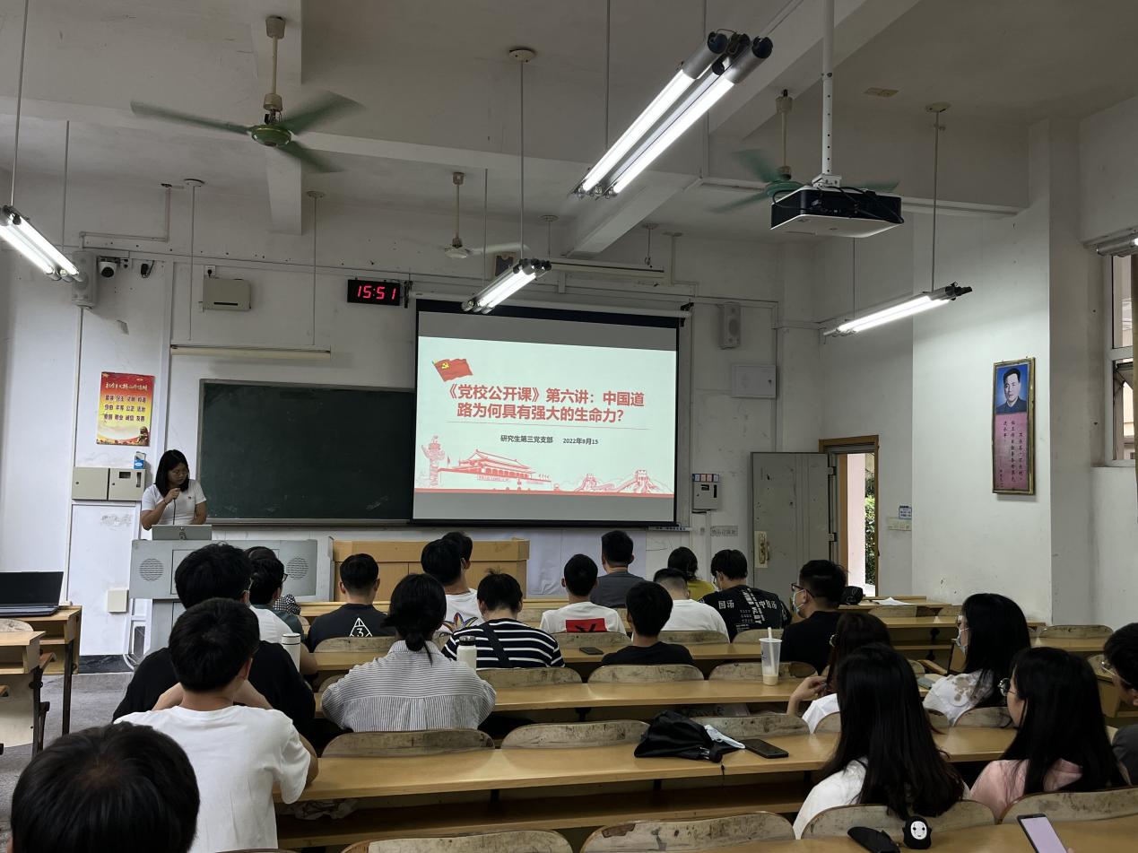 2022年9月15日,研究生第三党支部在屏风校区9114教室观看学习了《党校公开课》第六讲:中国道路为何具有强大的生命力的视频,支部书记唐子晴同志主持会议。