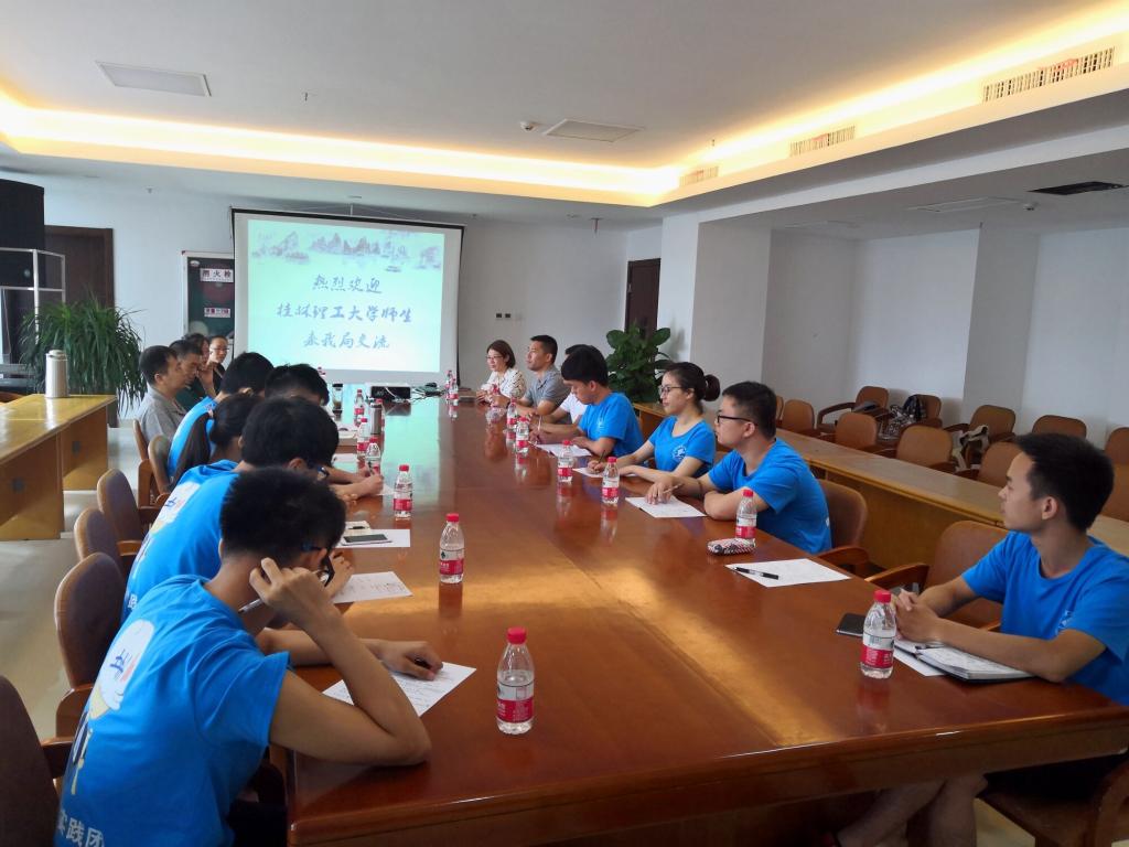 2018年7月27日上午,学院党委副书记王盛、学院院长助理邓春凤、辅导员安邦国和2015级10名学生代表在临桂区投资发展商务大楼南楼0908会议室与桂林市规划局相关领导进行了座谈交流,桂林市规划局党组蒙世和、城市规划科科长尧伟和档案科科长迟凌玲参加了座谈会。