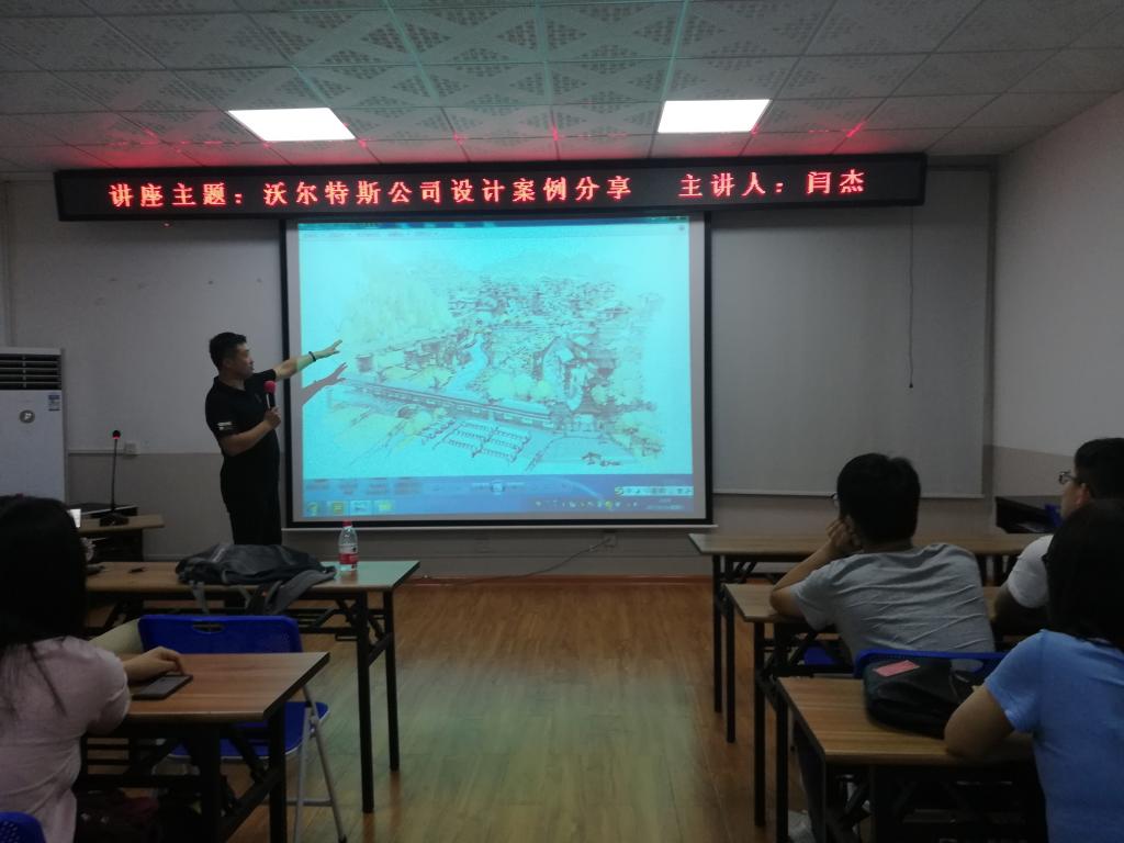 分享会上胡华中总监简单介绍了沃尔特斯公司设计建成的项目,在分享建成项目的经验同时,胡总监还不时给同学们抛出“建筑设计、规划设计是为了什么”“什么是设计”等问题,引发同学们的深入思考,胡总监对于他所理解的这些问题,也开始逐一作出回答。紧接着闫杰总监具体介绍沃尔特斯公司最精彩的落成项目之一——侗乡水庄。闫总监生动描述自己与对方斗智斗勇的场面——如何让自己的设计理念与对方的要求达成一致,在座同学听时捧腹大笑,听后却又感慨万分。