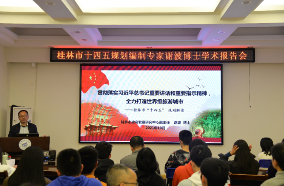 10月19日下午3时, 桂林市政府发展研究中心党组成员谢波博士在我校屏风校区4204会议室,为我院师生开展了主题为“贯彻落实习近平总书记重要讲话和重要指示精神,全力打造世界级旅游城市——桂林市“十四五”规划解读”的学术讲座。