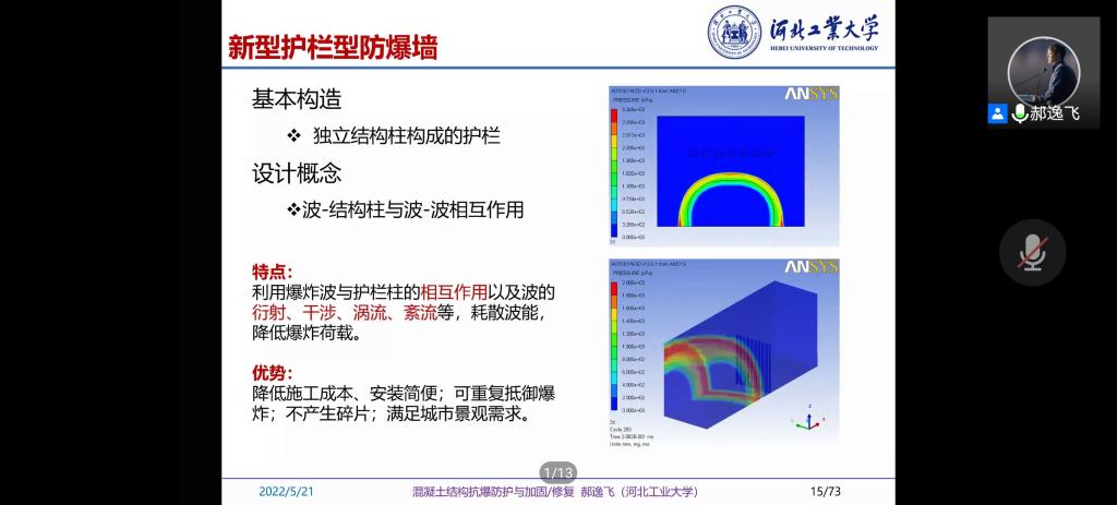 应学院邀请,5月21日上午,河北工业大学士木与交通学院郝逸飞教授以线上会议的方式为我院师生开展了题为“混凝土结构抗爆防护与加固/修复”的学术讲座。