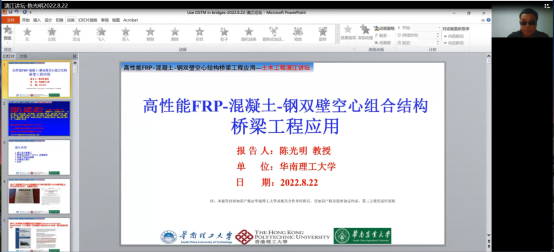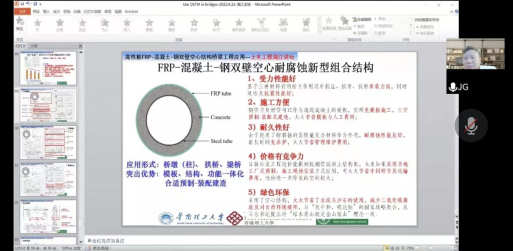 会上,陈光明教授首先向大家详细介绍了由香港理工大学滕锦光院士发明的新型组合构件——FRP-混凝土-钢(FCS)双壁空心组合构件的基本构造原理及其抗震性好、耐腐蚀、便于施工等诸多优异的工程性能。随后,陈教授通过大量工程实例,具体介绍了FCS双壁空心组合结构在桥墩、梁桥上承实腹式拱桥、上承空腹式拱桥中的成功应用及其显著的工程效益,并指出了该类型构件在推广应用过程中面临的挑战及解决思路等。最后,陈教授与大家进行了积极而富有成效的交流互动。