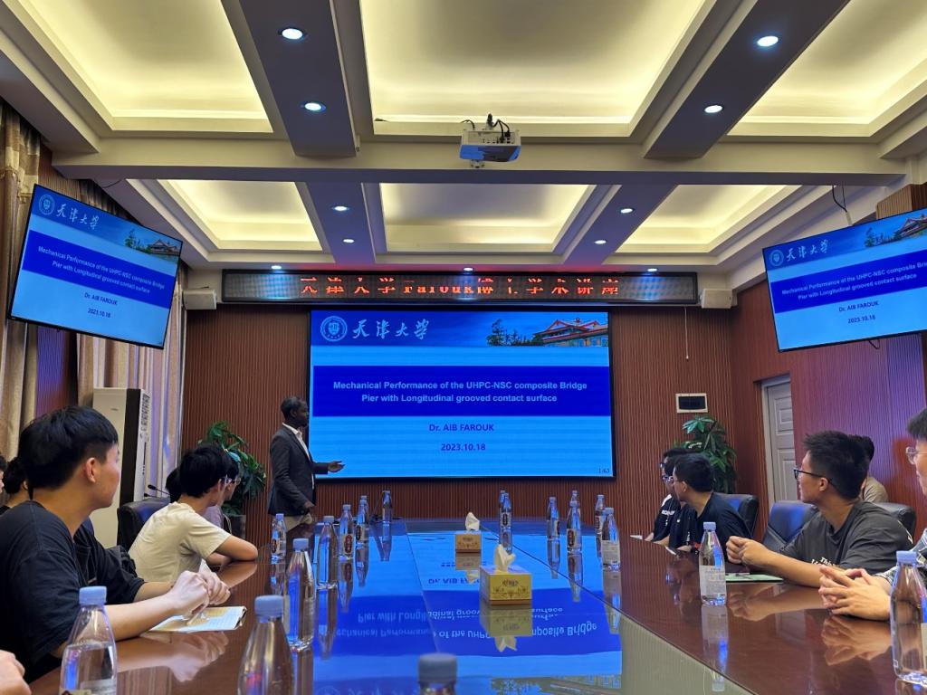 2023年10月18日下午3点,天津大学FAROUK博士在我院教四楼4222会议室进行学术交流。本次讲座的主题是“Mechanical Performance of the UHPC-NSC composite Bridge Pier with Longitudinal grooved contact surface”的学术讲座,我院研究生和教师积极参加,报告会由学院院长钱凯主持。