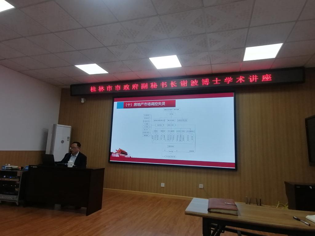 12月16日下午,桂林市市政府副秘书长谢波博士应我院邀请,在4203会议室开展了题为“我国房地产业发展的主要问题和政策调控效果”的学术讲座,报告会由曾榕书记主持。