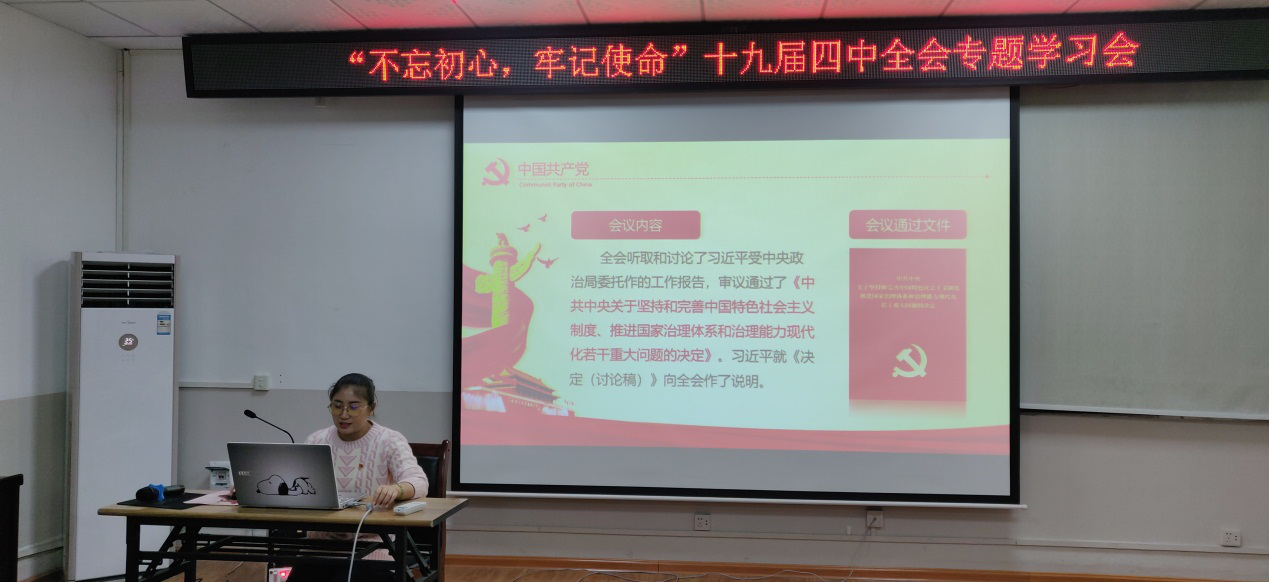 本次党课在姚慧同志的主持下,开篇讲述了党的十九届三中全会以来所取得的成就,引出本次党的十九届四中全会的内容,会议中肯定了党的十九届三中全会中央政治局的工作,并提出中国特色社会主义制度是党和人民在长期实践探索中形成的科学制度体系,我国国家治理一切工作和活动都依照中国特色社会主义制度展开,我国国家治理体系和治理能力是中国特色社会主义制度及其执行能力的集中体现。提出我国国家制度和国家治理体系具有多方面的显著优势,同时必须坚持中国共产党的指导思想。会议提出在建党100周年,在各方面制度更加成熟更加定型上取得明显成效;到2035年,各方面制度更加完善,基本实现国家治理体系和治理能力现代化;新中国成立100周年,全面实现国家治理体系和治理能力现代化,使中国特色社会主义制度更加巩固、优越性充分展现。最后会议号召全党全国各族人民要更加紧密地团结在以习近平同志为核心的党中央周围,坚定信心,保持定力,锐意进取,开拓创新,为坚持和完善中国特色社会主义制度、推进国家治理体系和治理能力现代化,实现“两个一百年”奋斗目标、实现中华民族伟大复兴的中国梦而努力奋斗!