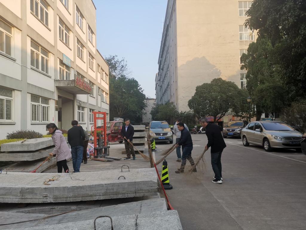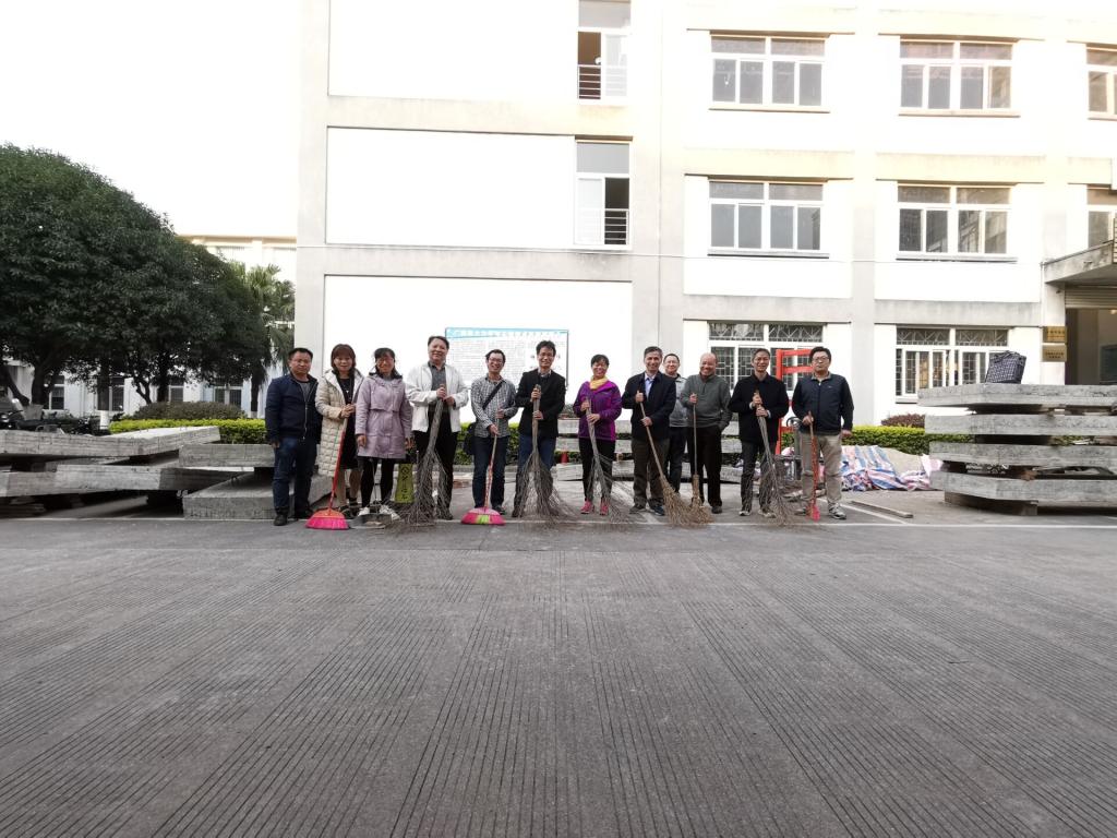 土建学院教工第一支部的全体党员在主题教育活动会后开始打扫教六楼周边环境卫生。