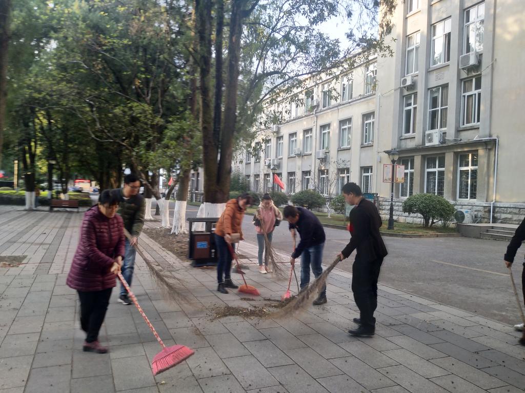 活动伊始,支部党员们带上扫把、垃圾铲等卫生清洁工具在教四楼门口集合,分别对前广场及两侧道路进行清扫,对道路两旁绿化带内的落叶、枯枝杂草、生活垃圾进行彻底清理。