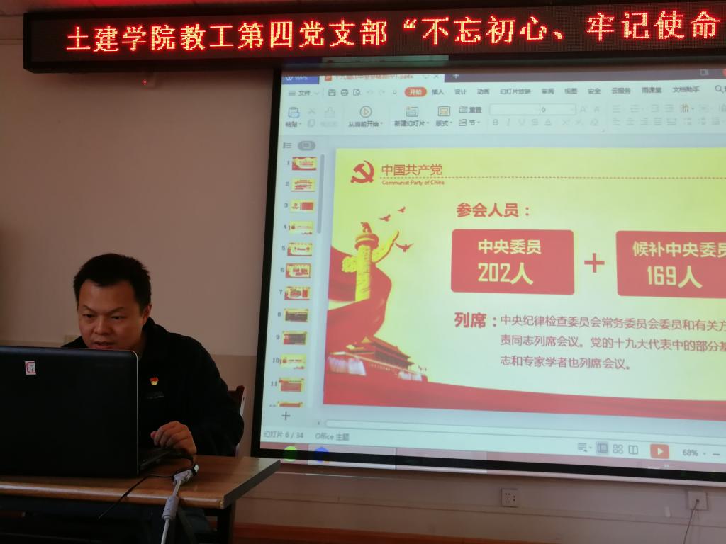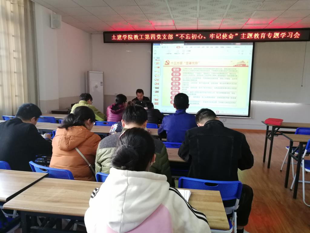 2019年11月25日下午3:30,土建学院教工第四党支部在4203会议室召开“不忘初心、牢记使命” 主题教育专题学习会。主要是学习中国共产党第十九届中央委员会第十次全体会议公报。会议由支部书记张毅同志主持,全体党员同志参加了会议。
