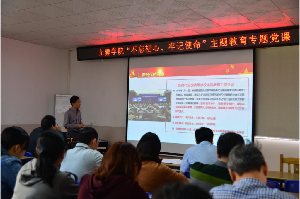党课上,余文成副院长从“新时代的召唤”,“学校的要求”和“我们的担当”三部分展开论述。他指出,全院教职工党员干部要深入贯彻党的教育方针和党的十九大精神,学习党“以本为本”,“四个回归”的教育精神,进一步提高教学质量水平,培养德智体美劳全面发展的社会主义建设者和接班人。