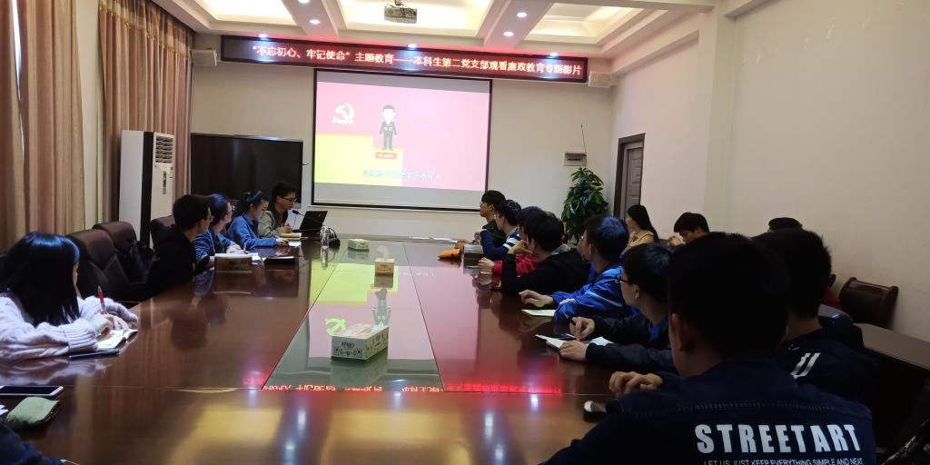 2019年11月14日,本科生第二党支部全体成员在4222观看了“不忘初心、牢记使命”主题教育廉政教育专题影片。会议由支部副书记李轲轲同志主持,支部书记余东东老师出席了会议。