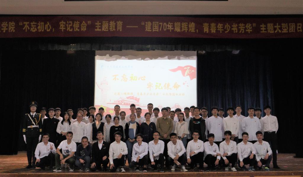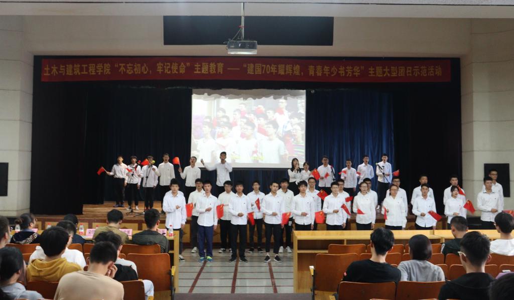 为庆祝中华人民共和国成立七十周年,深入推进学院“不忘初心、牢记使命”主题教育,进一步增强大学生的责任感和使命感,弘扬爱国主义精神,我院于11月12日下午在屏风校区南礼堂举办大型团日示范性活动,此次活动由土木工程2018-5团支部承办。学院团委书记姚慧、学工处组长宋明霞、学院2018级辅导员余东东、贾浩雨老师参加出席。