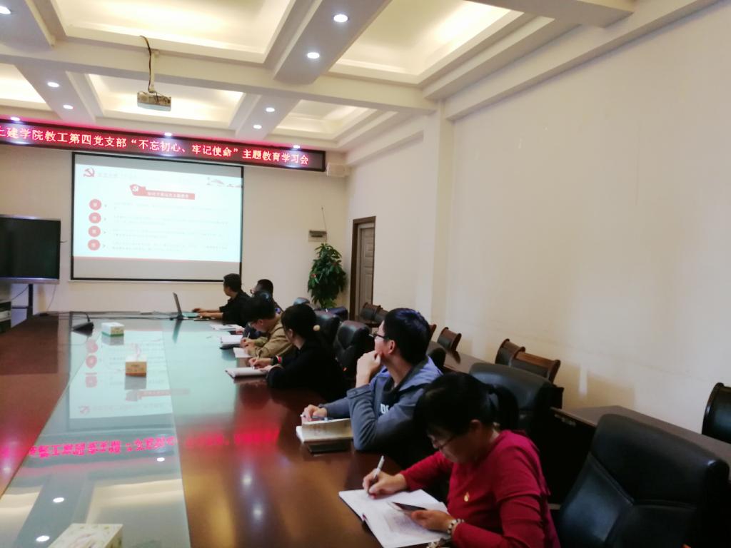 根据学校和学院“不忘初心、牢记使命”主题教育的部署要求,11月5日,教工第四党支部在4222会议室召开党员大会,组织全体党员进行了“不忘初心、牢记使命”主题教育集中学习。学习会由支部书记张毅同志主持,全体党员参加了会议。