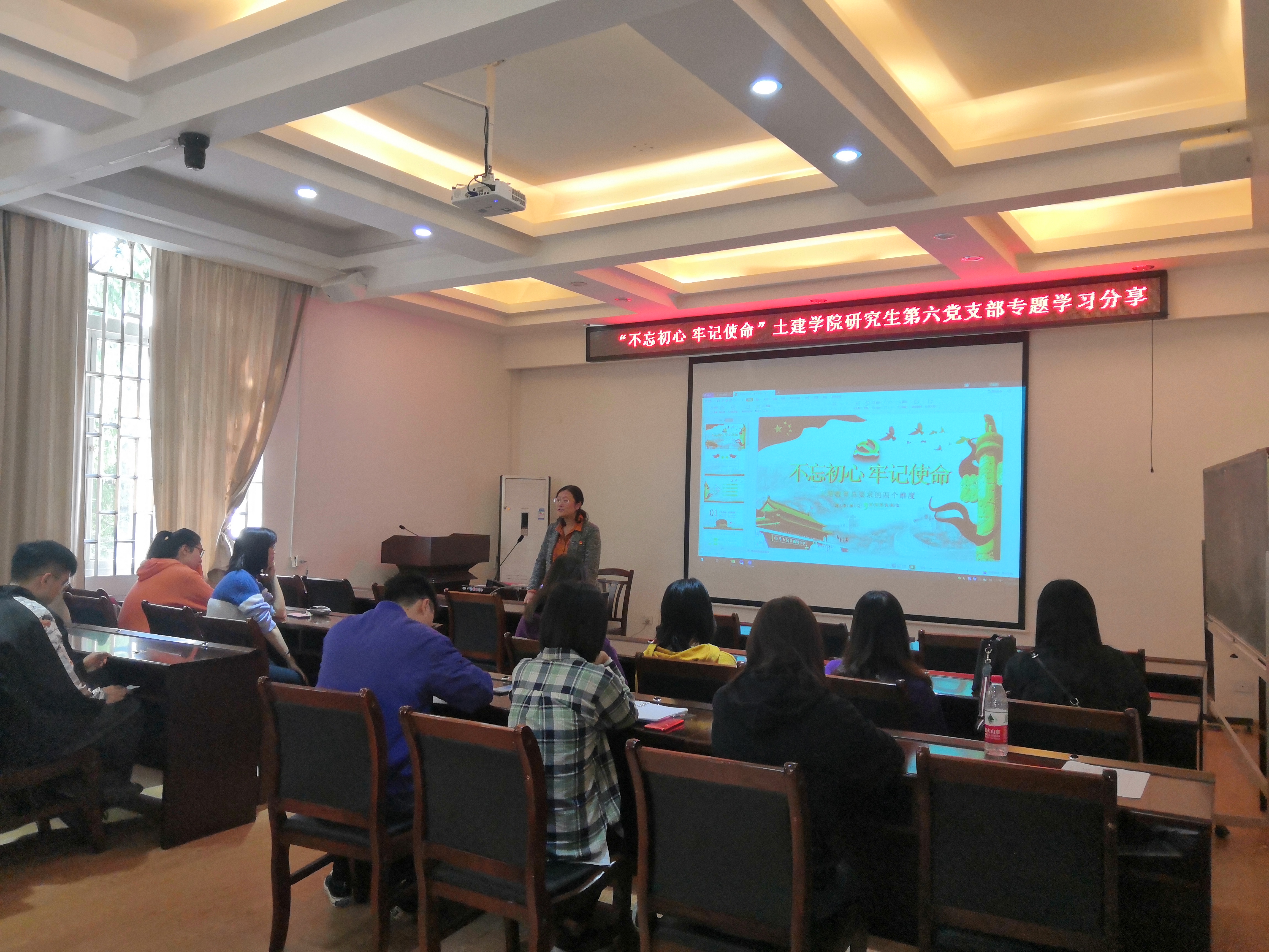会议开始,宋明霞老师围绕“不忘初心、牢记使命”这个主题向大家介绍了中国共产党的初心和使命,以及为什么要提出“不忘初心、牢记使命”。大家对这个主题有了深刻的理解后,宋明霞老师又跟大家进行了互动,大家就“研究生党员的初心和使命”这个话题进行了积极地讨论。最后,宋老师给大家讲了党员干部的信念和担当,并告诫我们每一名党员要坚定自己的理想信念,勇于担当作为。