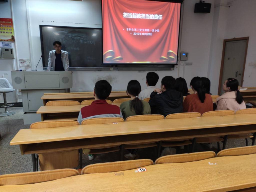 2019年10月20日晚上,学院本科生第三党支部第一党小组全体成员于9108教室开展学习会议。第三党支部第一党小组全体党员同志出席本次会议。